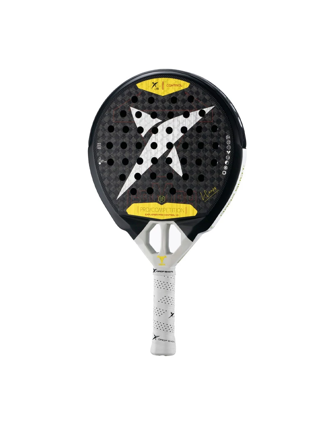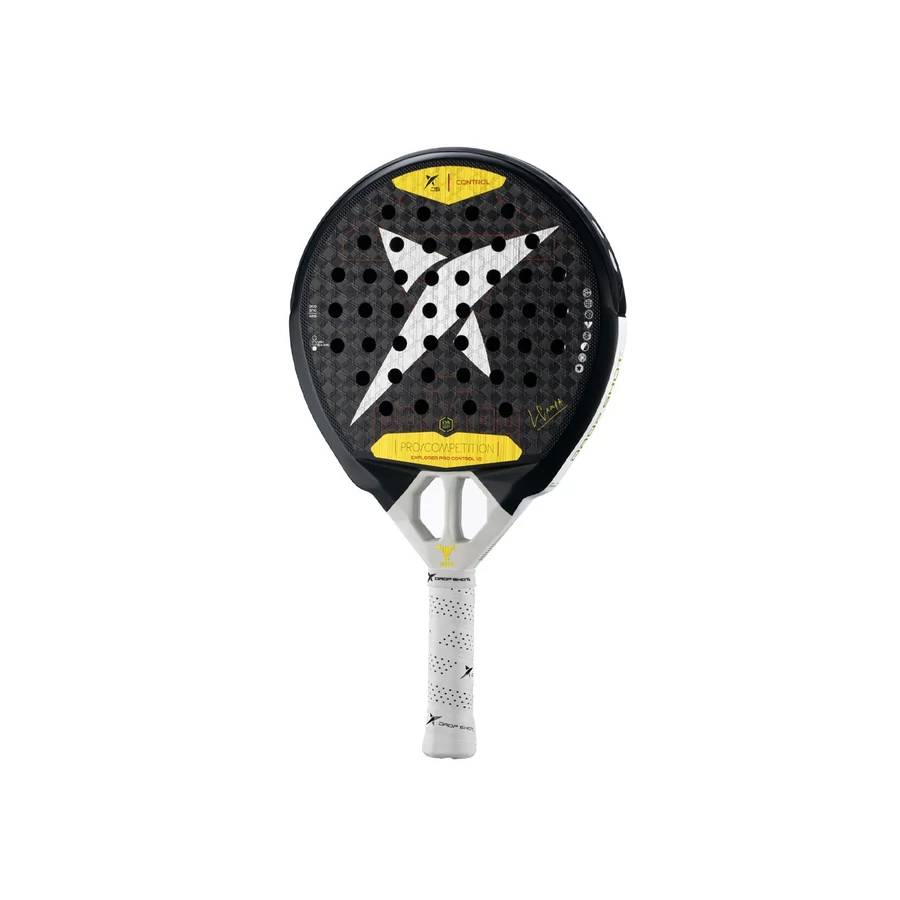 A Drop Shot Explorer Pro Control 1.0 egy prémium padel ütő, amely a kontroll és precizitás szerelmeseinek készült. Kifejezetten azoknak ajánlott, akik pontos játékot szeretnének játszani, anélkül, hogy a teljesítményből engednének. Fő jellemzők: Forma: Könnycsepp alakú, amely optimális egyensúlyt biztosít a manőverezhetőség és a teljesítmény között. Súly: 360–380 g, ideális a stabil, de könnyen kezelhető játékhoz. Egyensúly: Közepes, ami gyors reakciót és kényelmes fogást tesz lehetővé. Mag: Eva Tech hab, amely kényelmes ütésérzetet és vibrációcsökkentést biztosít. Felület: 12K karbon, amely növeli az ütő tartósságát és precizitását. Keret: Karbonszál, hosszú távon is stabil játékot biztosít. Technológiák és előnyök: Smart Holes System: Optimalizált lyukelosztás a jobb labdakontroll érdekében. Core Shox: Vibrációcsökkentés a kényelmesebb játékért. Power Beam Heart: Növeli az ütő stabilitását és pontosságát. Cork Cushion Grip: Kényelmes, biztonságos fogás. Silicone Channel: Csökkenti a karfáradtságot. PU Soft Protector: Védi a keretet az ütésektől. Az Explorer Pro Control 1.0 tökéletes választás azoknak, akik a kontrollt helyezik előtérbe. A közepes súlypont és a könnycsepp alak lehetővé teszi a gyors reakciót és a precíz labdakezelést. Az Eva Tech hab és a 12K karbon kombinációja kiegyensúlyozott teljesítményt, erőt és kényelmet biztosít minden játékstílushoz. A Drop Shot Explorer Pro Control 1.0 ideális választás a haladó játékosoknak, akik szeretnék maximalizálni a kontrollt és precizitást a pályán, miközben kényelmes, tartós és stabil ütőt használnak.